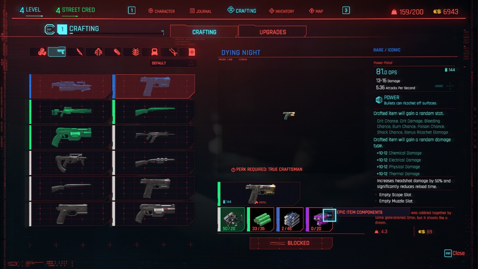 The way Cyberpunk’s systems are built means a lot of its variety comes from the constant loot carousel. You’ll be pawing through granular stats to switch to something with 0.3 more DPS after nearly every fight. So while you’re facing similar targets a lot, you’re doing it with a different toolkit each time. Once you find something that works for you, crafting skills can be used to upgrade a favourite gun or craft a familiar replacement.