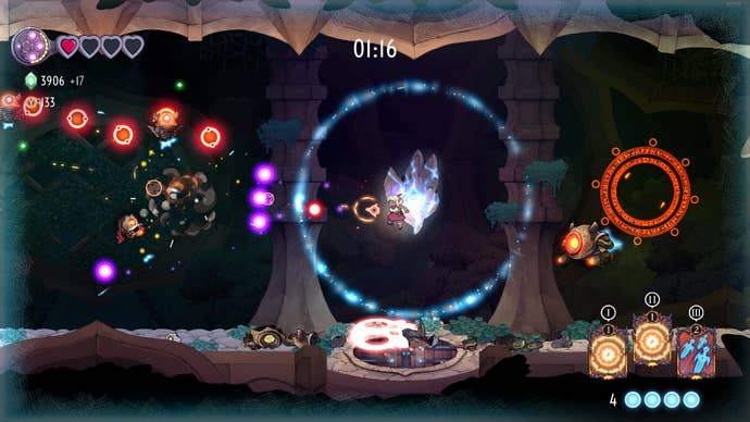 This spell deck is the sole source of customisation in The Knight Witch. With it, you can pick and choose what sort of combat style you want to mess around with. Me? I really liked magic blast modifiers, taking duplicates of the Hand Cannon card, a reload spell, and filled out the other slots with defensive options so I can keep up my weapon of choice constantly. However, the game does throw a nice range of different spells your way that significantly alter the way you approach fights.